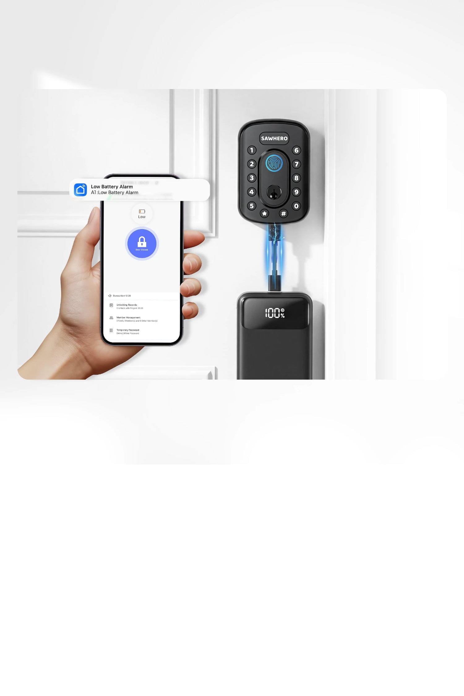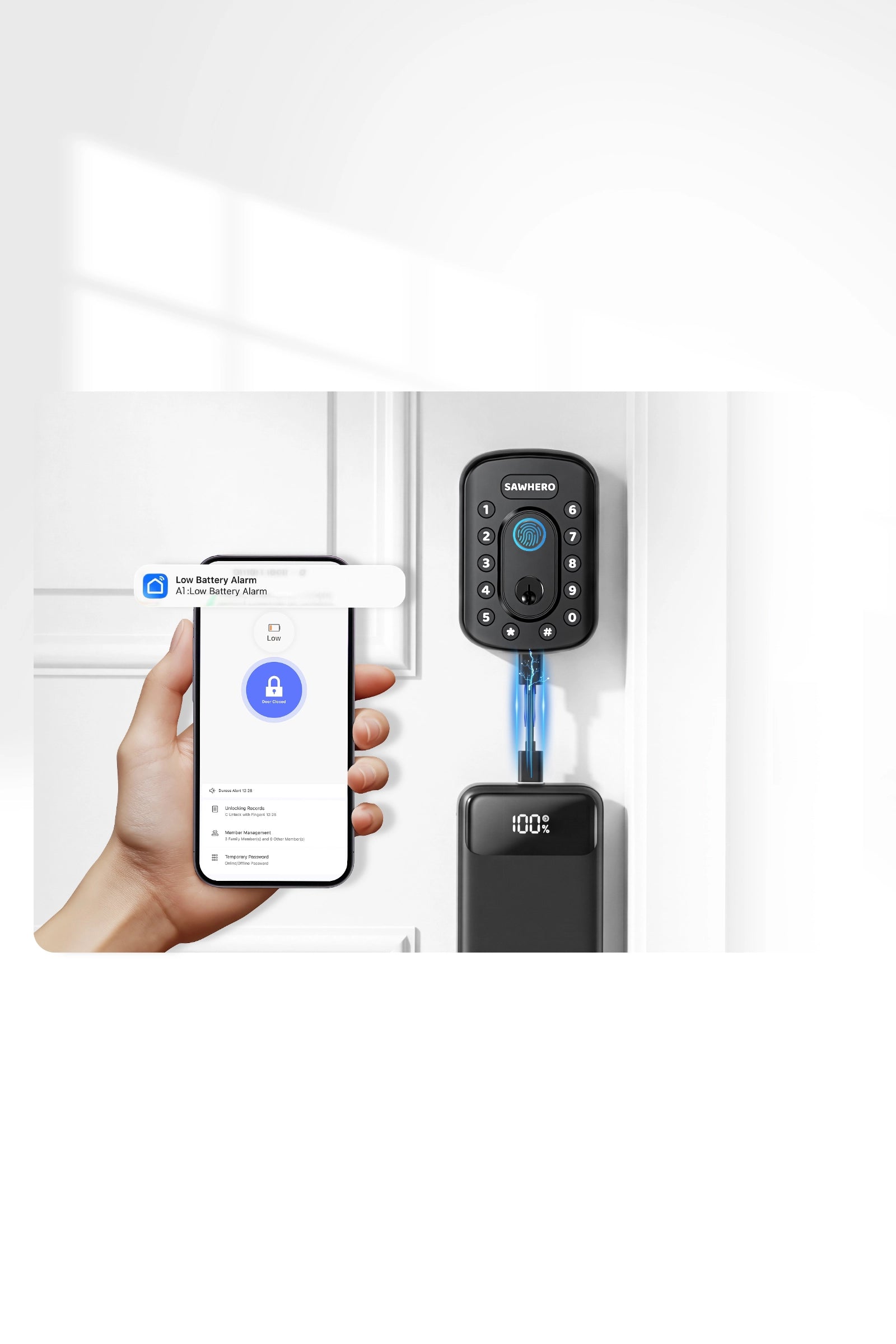 Powered by 4 AA batteries (not included), the lock lasts up to 6 months under normal use. If the batteries run out, simply connect a power bank to the Type-C port to unlock the door. The Type-C port is for emergency power only—replace the batteries promptly after use.