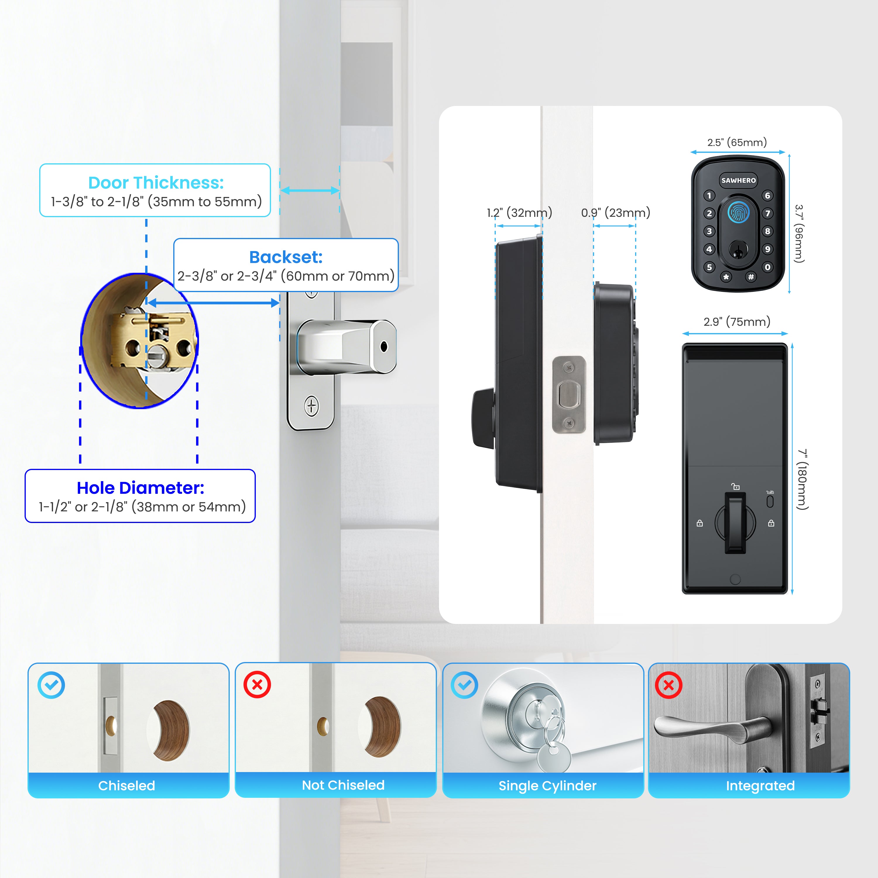 - Door Backset: 2-3/8" (60mm) and 2-1/8" (70mm)